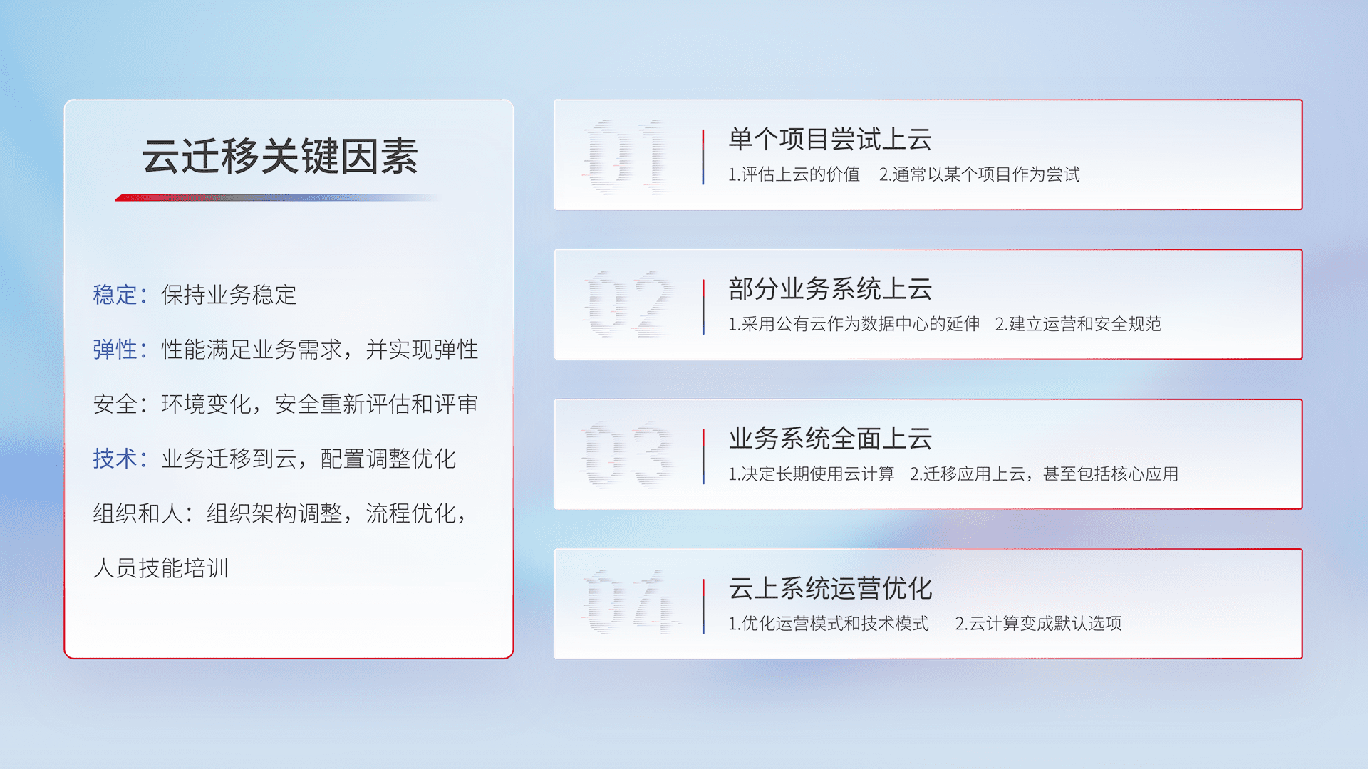 结合实际业务,,,从规划设计、、、、云平台选型、、云原生改造、、数据迁移、、、集成交付,,迁移全过程为客户识别最佳上云路径,,,做好风险识别管理,,设计网络架构、、、身份权限、、、安全审计合规、、、操作审计、、、日志审计、、监控告警策略、、、多站点容灾设计等,,,,对云上基础设施进行整体规划,,,,提升IT治理水平,,,以满足弹性、、、高可用、、高性能的需求。。